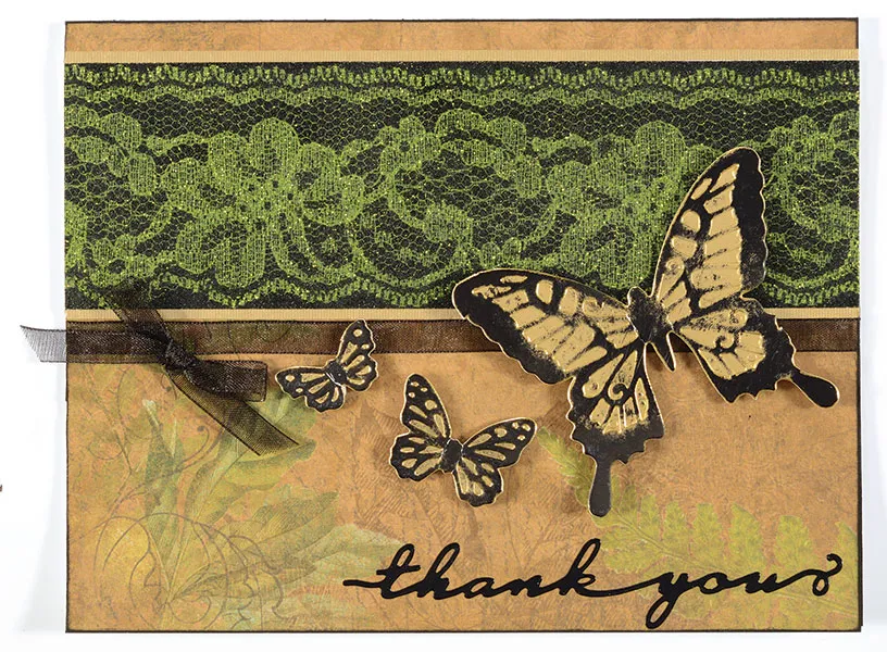 Ink the embossed surface of the Butterflies Foiled Fancies that you will use with SurfaceZ Black ink. Let dry. Lightly fold the wings of the butterflies together for added dimension. Foam tape the bodies on the card as shown. Place Card Greetings Dazzles™ “thank you” across the bottom right. Tie a black sheer bow and Zot™ as shown.