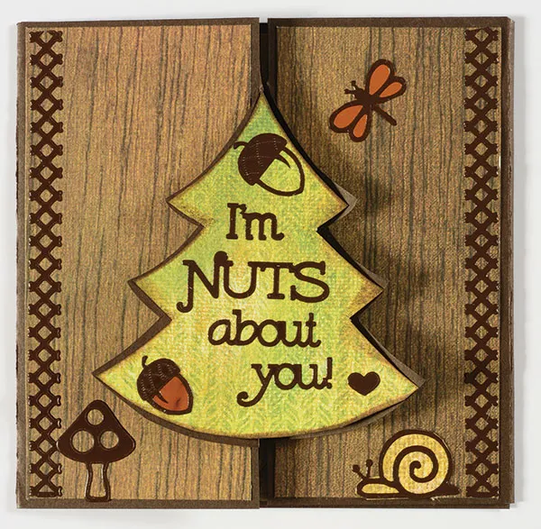 Trace and cut one side of the larger tree shape, on Serenity green paper. Turn the template over to trace the other side. Cut out, and ink the edges. Foam tape only the left side of the tree in place on the left panel. Place the word Dazzles™ as shown. Back one acorn with copper mirror sheet, and cut close to the Dazzles™ edge. Glue the two acorns as shown Back a small dragonfly Dazzles™ with copper mirror sheet. Cut close to the edge, and glue on the right. Back a snail Dazzles™ with Serenity yellow paper. Glue on the bottom right. Place the border and mushroom Dazzles™ as shown.
