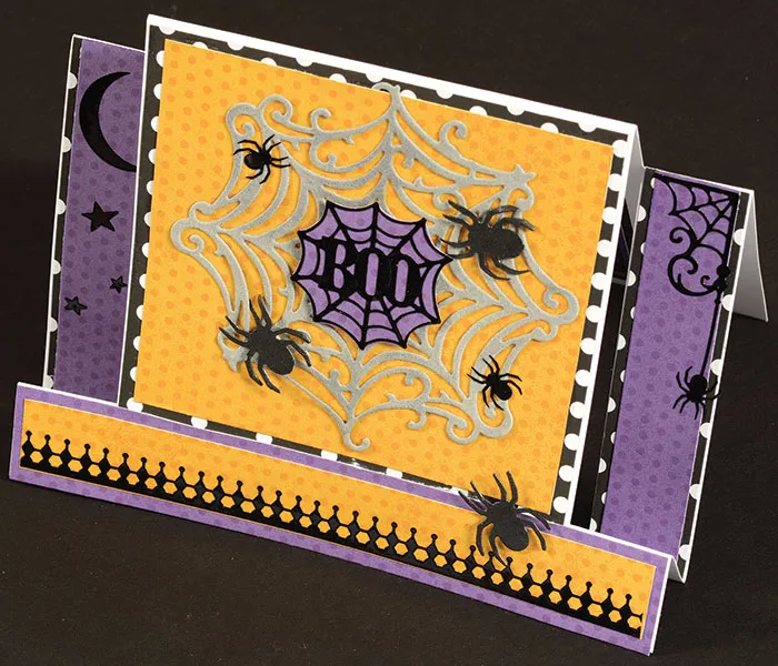 Die cut a Smoke suede spider web. Cut off the spider. Glue centered on the top center step. Back the “BOO” Dazzles™ with Colorist purple dot paper. Cut close to the Dazzles™ edge. Foam tape on the spider web center. Die cut three Onyx glimmer spiders. Foam tape on the web. Place Dazzles™ as shown.