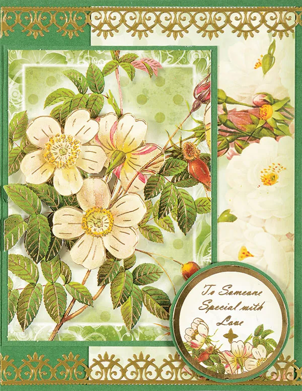 Card front: Place a blank card with the fold on your left. Cover with green cardstock. Use the right border of the Wild Rose border paper and glue a 3½”x6¼” Wild Rose border cardstock on the left, 1/8” from the edge.