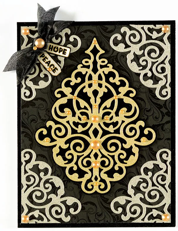 Cut a tapestry die-cut from gold pearl paper, remove the paper backing and place the die-cut on black suede paper. Cut around the outer edges of the die-cut leaving a 1/16” border of the suede. Glue centered between the silver pearl corner pieces.