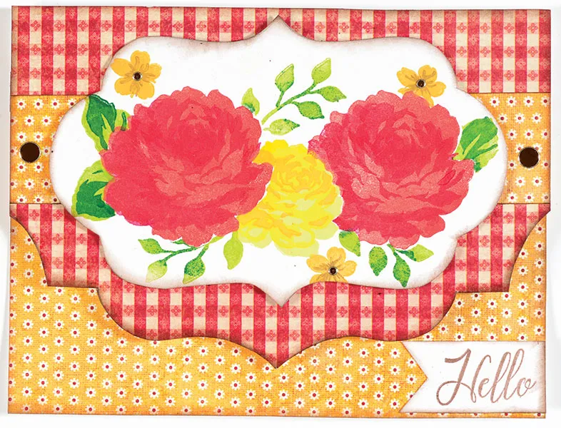 Place the card fold on the top and cover with red plaid, Home Grown paper. Place the Design Tool Kit #10 Olive 3 pattern even with the card top and trace the patterned bottom edge to the card front and cut out. Ink edges of 6 1/2"”x1 ¼” yellow floral paper strip brown and glue across the card, 1” from the top. Ink the card edges brown. Trace the Design Tool Kit label shape Peggy 3 onto white cardstock and cut out. Stamp the large bottom layer of the rose stamp onto scrap paper and cut out make bake a mask. Repeat for the small rose. Stamp 1 large red rose on the left side of the label shape, using light red for the base, medium and then dark red for the top detail images. Place the rose mask over the red rose and stamp the small rose image using yellow inks. Mask the yellow rose and stamp a large red rose on the right side of the label.