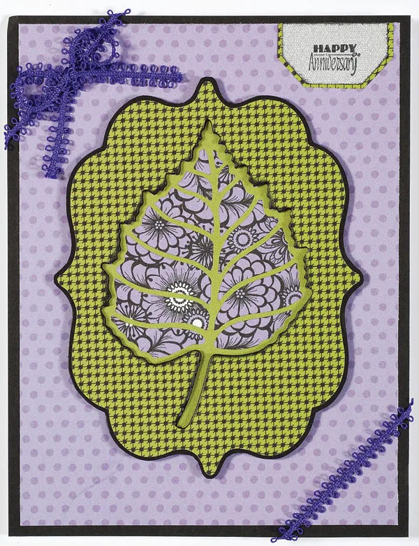 Card inside: Mat a 4”x4” Simply Susan purple floral paper on black cardstock with a 1/8” border and glue on your card center. Trace and cut out a Bracket Label-A from Simply Susan olive paper, ink the edges and foam tape on the center.