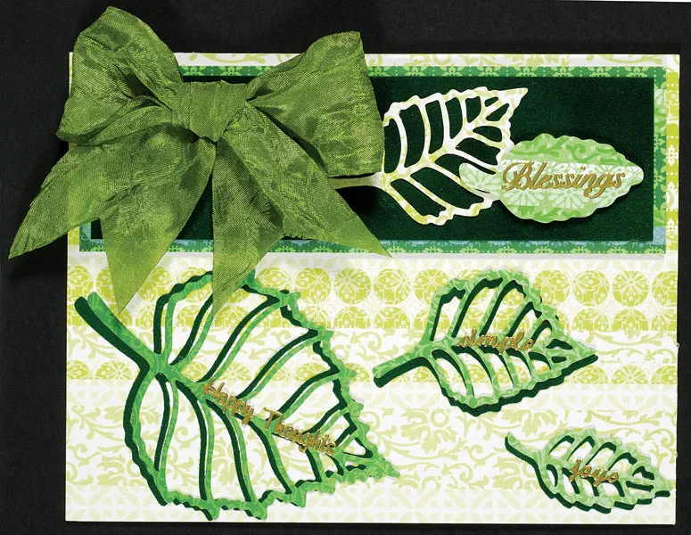TECHNIQUE: LEAF SHADOWS Following your die cutting machine manufacturer’s instructions, cut one suede leaf from each cutting die (a leaf set). Glue on your card as shown. Cut one leaf set from Gypsy Jewels green ombre paper and glue over the suede leaves, off-setting to create a “shadow”. Place word Dazzles™ on the leaves, as shown.