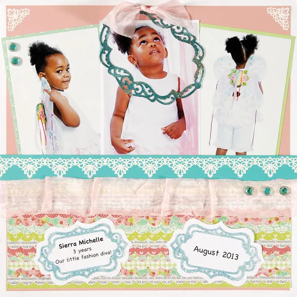 Journaling: Cut 2 Lacey Labels of each size, medium and large. Keep the “innies” of the two large labels. Print name and quote on one and the date on the other. Ink the small Lacy Label with VersaMark™ ink and sprinkle with the Encrusted Jewel Detail Capri embossing powder. Heat set, and repeat for second small frame. Glue your Lacy Label onto “innies” journaling and glue to the bottom of page, as shown.