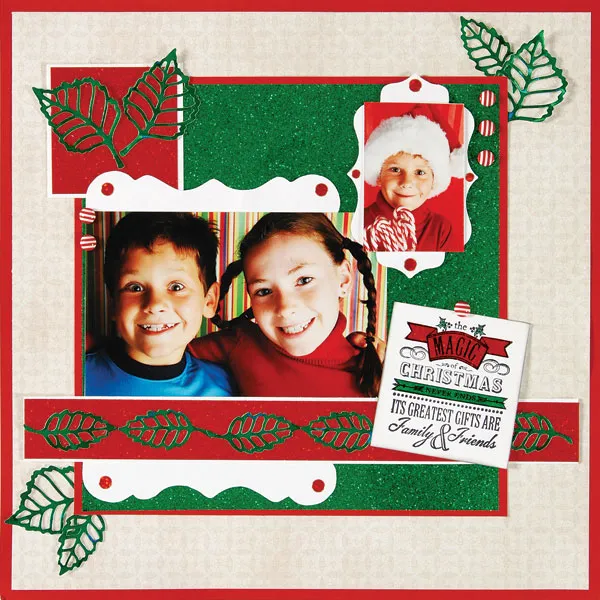 Page: Use cutting die to cut 8 small leaves, and 4 medium leaves from Green Circles Holographic paper, set aside. Cut 4 5/8” Lacy Label from white cardstock, set aside inside of frame. Glue 11½”x11½” Christmas Sweets ivory pattern paper on to red cardstock with a ¼” border. Cut 8½”x8½” from Green Smooth Glitter Sheet. Cut 9”x9” red cardstock, peel Green Smooth Glitter Sheet and place on cardstock leaving ¼” on all sides. Glue 1½” from left side, 1¾” from bottom. Peel and mat on to white cardstock 11”x½” Red Smooth Glitter Paper strip, as well as 2”x2 ½” square. Use largest Design Tool Stencil to trace on to white cardstock, cut. Cut 2¾”x3” white cardstock, stamp “The Magic of Christmas” stamp centered. Stamp on Red Smooth Glitter Sheet, and Green Smooth Glitter Sheet. Cut out the word “Magic” on red, and the words “Never Ends” from green, peel and apply over original stamped image as shown.