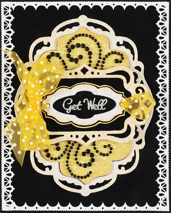Card inside: Die cut the largest lacy label to create a center label from Black Suede and glue on center. Create a 3 3/4”x2 1/4” Rosemary & Thyme yellow label frame and glue in the center. Create a small swirl die-cut from Black Suede and glue on the bottom left corner. Cut the rhinestone border swirls and place as shown. Place “Get Better Quick” Dazzles™ in the center. Zot™ a yellow dotted bow on the bottom left side of the label.