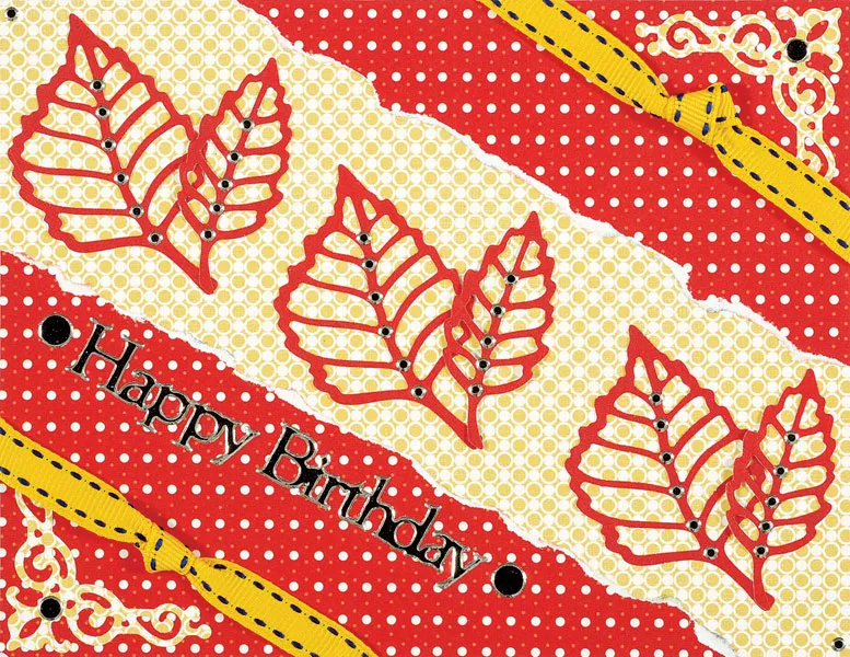Cut a 6 1/2”x5” Happy Days red dot paper and tear the center area out at an angle, as shown, to expose the leaves. Glue in place. Cut two fancy corner die-cuts from Happy Days blue arcs paper and glue as shown.