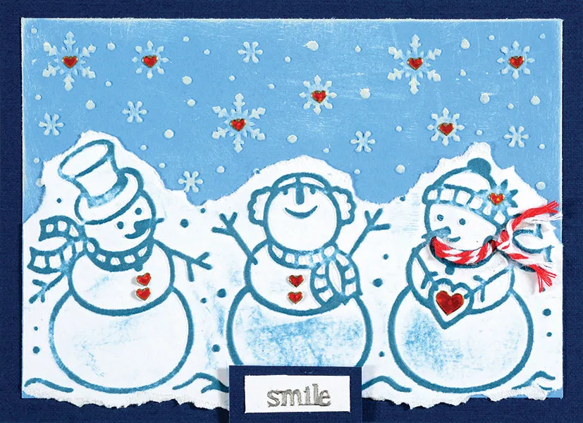 Use the Row of Snowmen embossing folder and a die cutting machine to emboss a 6”x4¼” light blue cardstock, and a 6”x4¼” white cardstock. Lightly rub the white ink over the snowflake area of the blue cardstock. Trim to 5¾"x4”. Ink the edges. Lightly rub the Stormy Sky ink over the snowman part of the white cardstock. Tear loosely around the snowman area, keeping the snowmen attached to each other. Punch a hole on the left side scarf and scarf knot of the right snowman. Thread a 4” red/white bakers twine two times through the holes. Tie a knot like a scarf. Zot to hold in place. Glue to the blue cardstock. Glue blue cardstock to the card front.