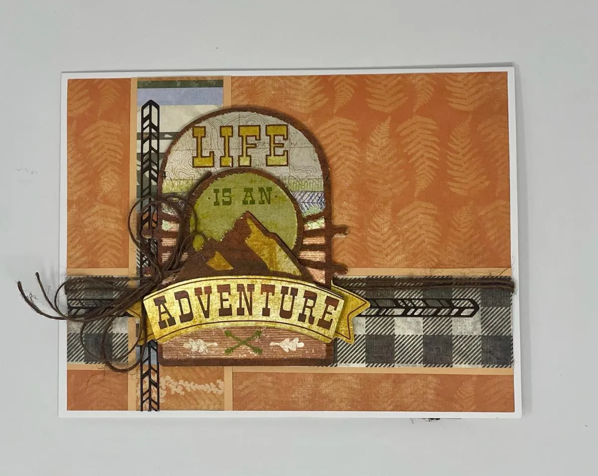 3. Assemble the Trail Blazer “life is an adventure” paper tole design with foam tape between the layers. Foam tape it to the front as shown. Make a 4-loop brown jute bow and tie the center with brown jute. Glue the bow as shown.