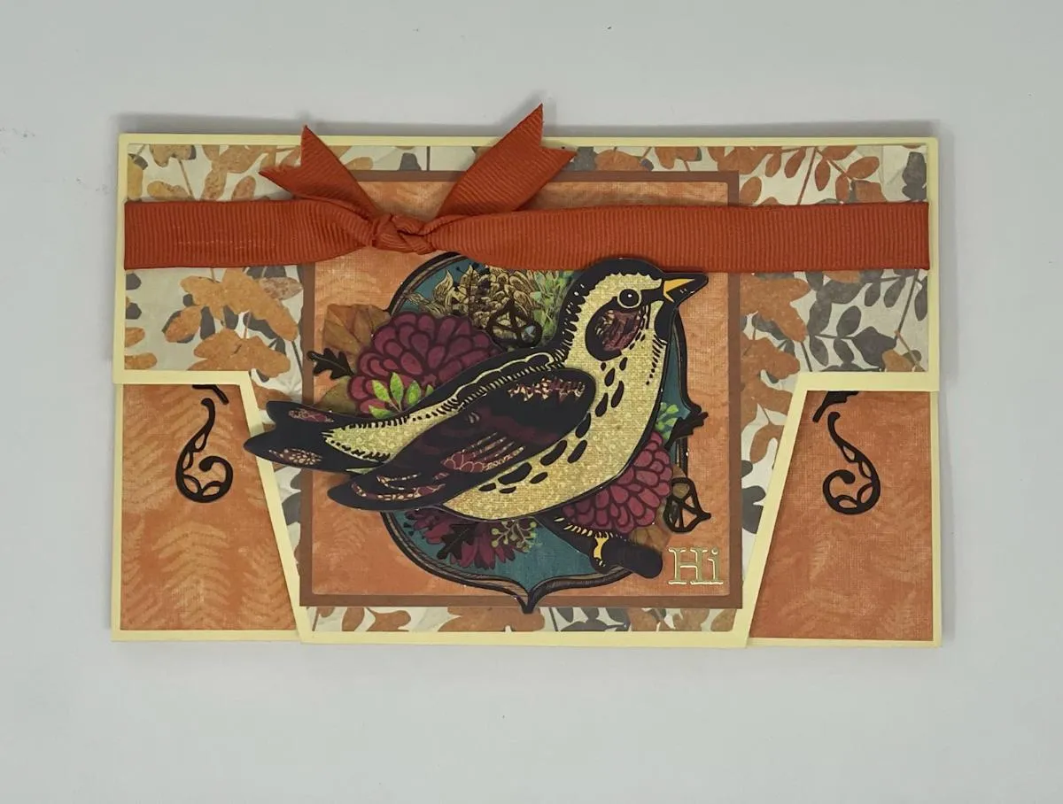 6. Cut a 3¼"x3¼" North Country orange paper and mat it on light brown solid cardstock with ⅛" borders. Assemble the Serenity bird paper tole design with foam tape between the layers, then glue it to the orange square. Place gold “hi” Dazzles™ in the lower right corner, then glue the square to the front, tucking it under the ribbon.