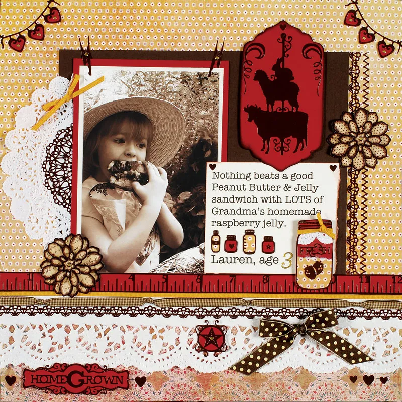 Write on a 4”x3 1/2” piece of ivory cardstock and tear the right edge. Ink the edges brown and glue to the lower right side of the photo mat. Replace numbers in the text with Dazzles™ gold numbers. Back “Home Grown” sticker with red cardstock and trim edges evenly. Foam tape to the bottom left corner as shown. Place tiny heart Dazzles™ at the top corners. Back tiny jars with red cardstock and yellow flower paper strip and glue between the text.