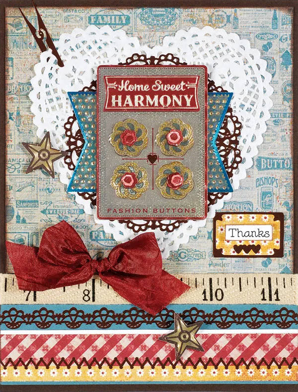 Write or computer print “Thanks” on white cardstock, trim, ink edges and foam tape to yellow flowers paper. Add the small frame sticker around the word, and trim the edges evenly. Add heart sticker as shown. Glue to lower right of the heart doily. Foam tape star die-cuts (extra art) as shown. Tie a maroon crepe ribbon bow and Zot™ to the card front as shown.