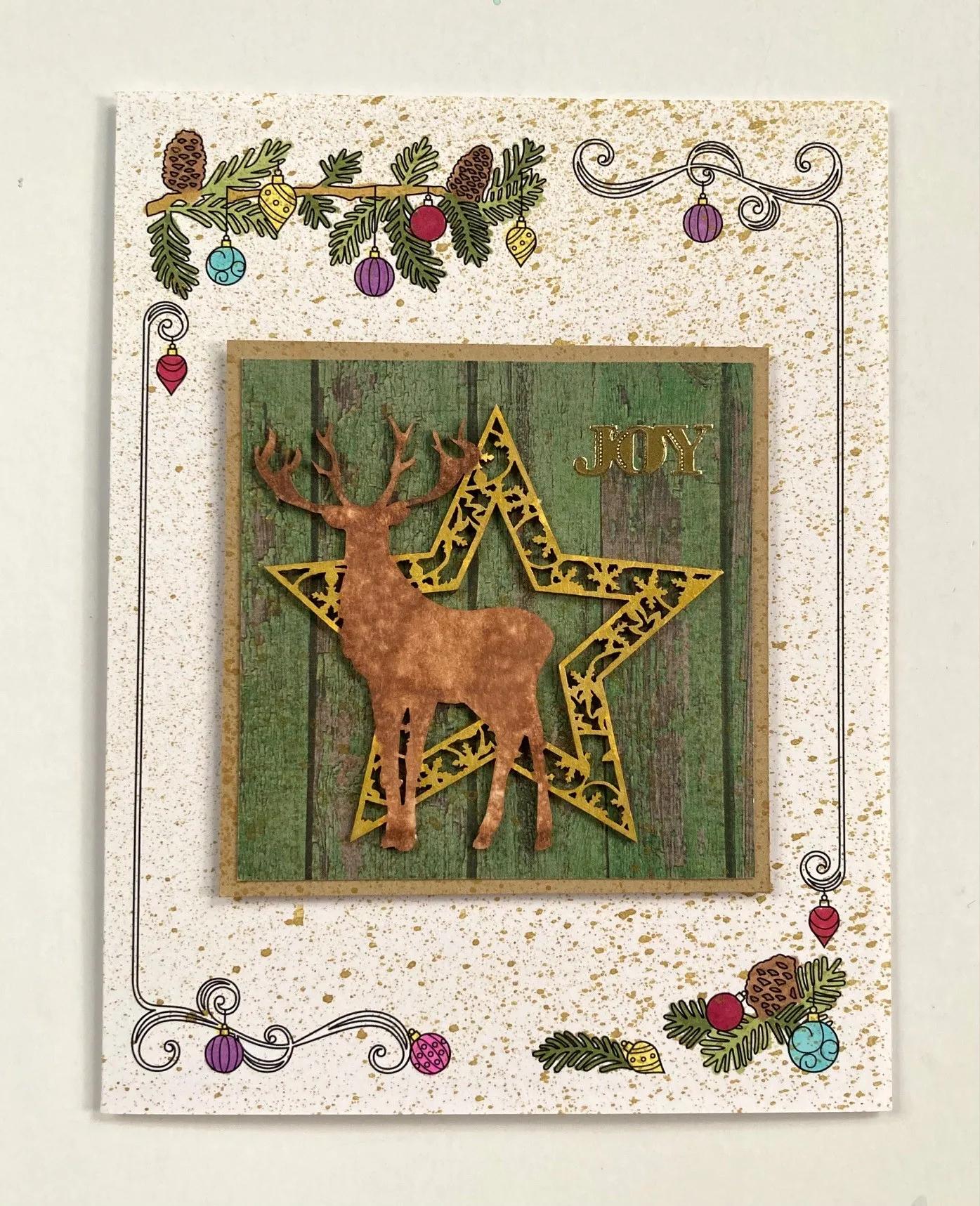3. Use the paint brush to paint the star with Glamour Gold. Cut 3¼"x3¼" Wood & Woodland green boards cardstock and mat it on tan cardstock with ⅛" borders. Spritz it with gold. When it’s dry, glue the deer and star to the center and place gold “joy” Dazzles™ at the upper right. Foam tape the square to the card front.