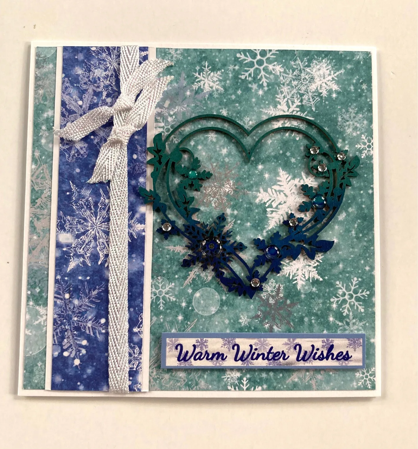 3. Remove the chipboard hearts from the backing. Press the teal ink pad over the upper half of one heart and the Royal Blue ink pad over the lower half until the chipboard is completely colored. Let it dry, then place dewdrops and clear stickers on the snowflake centers. Glue the heart and foam tape the “warm winter wishes” label chipboard as shown.