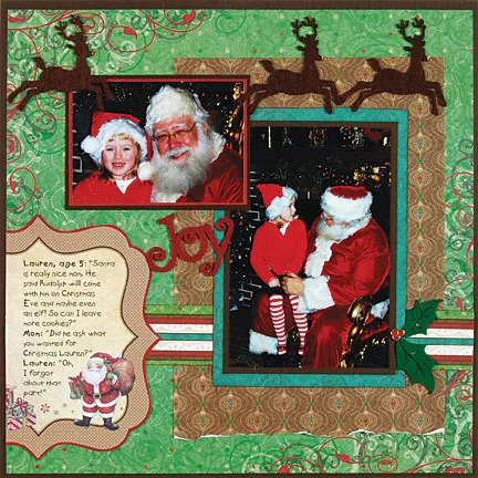 Glue 3 felt reindeer across the top of the page. Place tiny red Jewel Dazzles on each nose. Glue a felt "Joy" to the left of the large photo and a holly leaf sprig to the lower right edge of the photo. Place a cluster of 3 medium Jewel Dazzles on the holly for berries.