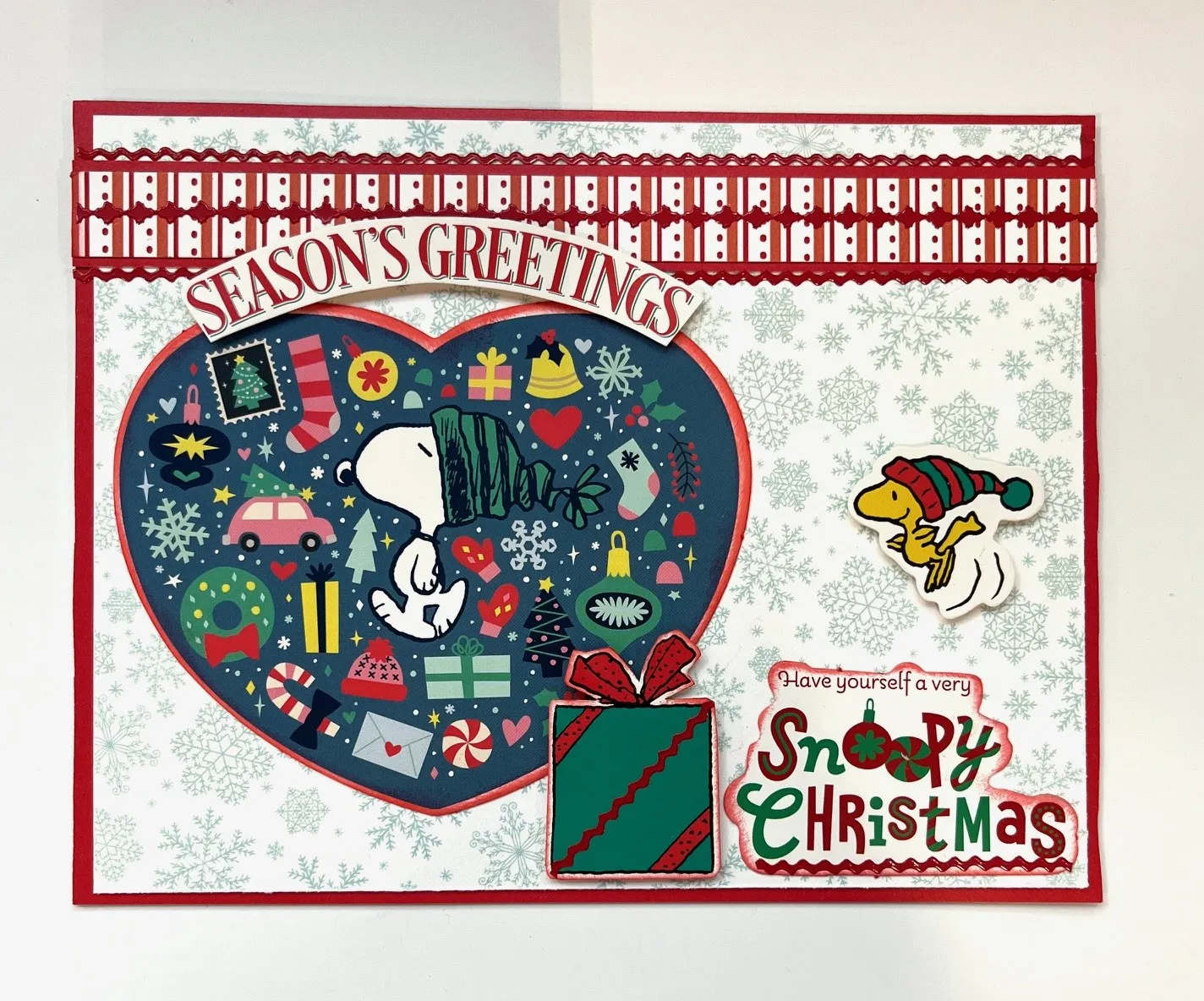 Debbie covered her 6 ½”x5” card with red Festive Holiday 8x8 cardstock. She cut 6 ¼”x4 ¾” teal snowflakes and glued it in the center. She matted 6 ½”x1/2” stripe on red then glued it close to the fold. She placed red Thin Line Primary Dazzles™ on each long edge and in the center of the stripe. She glued 4” Snoopy heart Peanuts Topper on the left with “Season’s Greetings” ephemera piece on top. Debbie foam taped Woodstock bird ephemera on the right. She placed the present and “Snoopy Christmas” ephemera pieces on a craft mat and used a blending brush to color the edges with letterbox red ink pad. She foam taped them to the card.