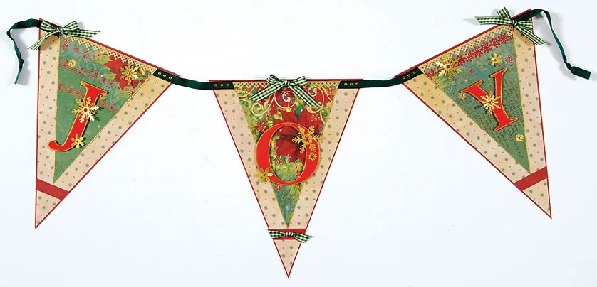 Use the Build a Banner Template to trace three Medium Pennant shapes on the Christmas poinsettia paper—see the diagram for placement. You can trace on the printed side of the paper, just trim off any pencil lines. Cut out.