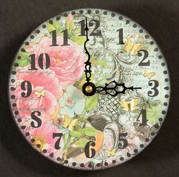 Hold the cardstock circle on the center (or tape in place) of the stencil. Use the cosmetic sponge to apply black ink inside the numbers and outer dots of the stencil. Remove the stencil. Ink the edges of the paper. Glue the paper circle onto the wood circle. Turn the circle over and use your knife to cut away the excess paper covering the hole. Turn the clock face right side up.