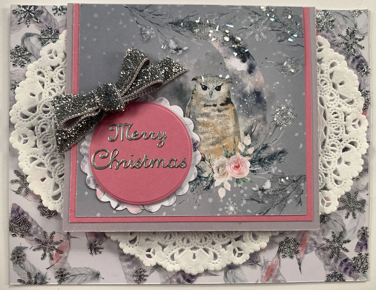 Die cut the small circle out of pink Matt-tastic and use the scallop die out of feather 8x8 paper (it’s on the back side of the owl paper). Foam tape together and add Christmas Greeting Dazzles™ to the center. Glue to the card and Zot™ a 2” silver bow as shown.