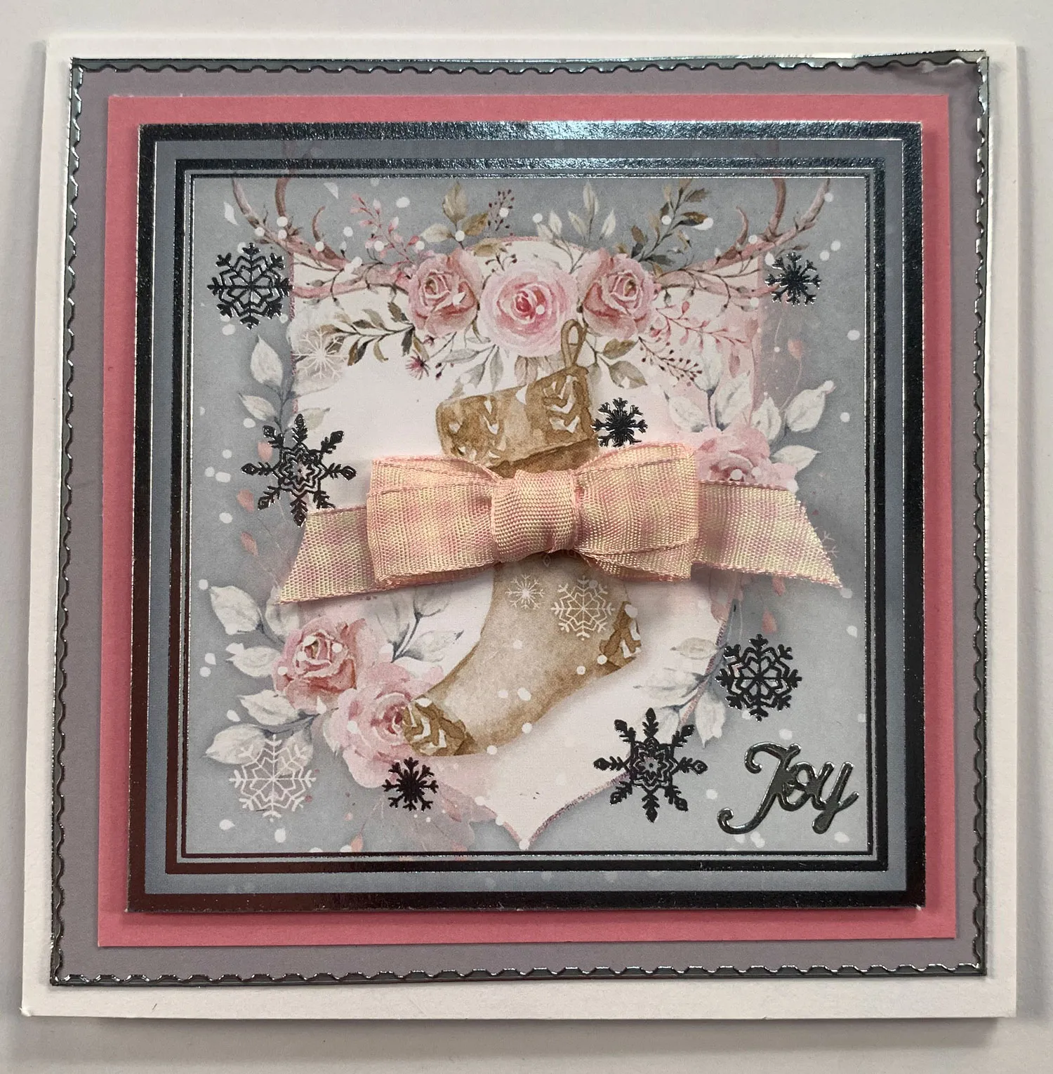 Cut a card to 4 1/2” square. Foam tape the stocking Topper to pink Matt-tastic and cut leaving 1/8” border. Glue to gray Matt-tastic leaving 1/8” border. Glue to the card. Add silver Thin Line Dazzles™ as shown. Zot™ a 1 1/2” wide bow as shown. Place a Dazzles™ Greeting to the lower right corner.