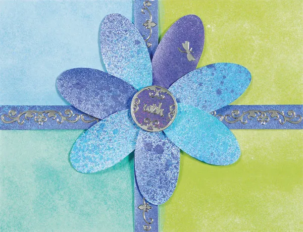 Spritz the sheet of white cardstock with both colors of Smooch, allowing the colors to mix in some areas, and with some light and dark areas of each color. Use the 2”x1” oval shape on the template to trace and cut out 7 ovals for flower petals with contrasting color and value. Cut four ½” wide strips from the purple spritzed areas and glue across the center of the card, horizontally and vertically. Add Dazzles™ as shown.