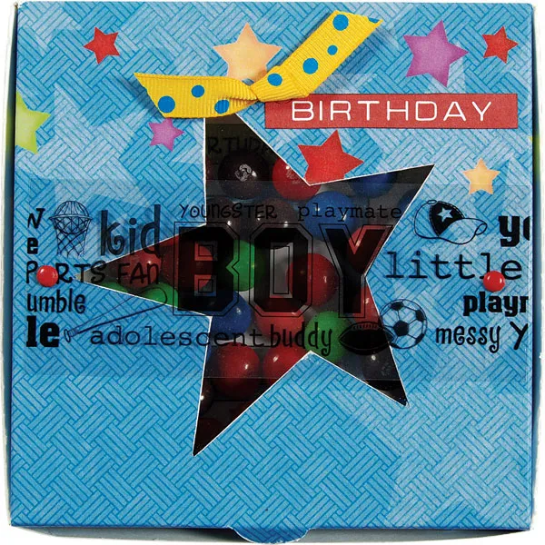 Cut the “boy” border from the overlay. Glue a large square of blank overlay to the inside of the lid, covering the star opening. Center the word “boy” inside the star on the outside of the box. Trim excess overlay even with the lid sides and punch holes on each end to secure mini brads through overlay border. Glue “Birthday” cut out strip at the top right corner with a knotted length of ribbon.