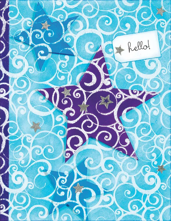 Use the template to trace and cut out two 2” stars from remaining swirls paper to match the background on the card front as shown. Use the inkpad to color the star shapes blue, then wipe off excess with the paper towel. Repeat for a 3 ½” purple star. Foam tape the stars to the card front.