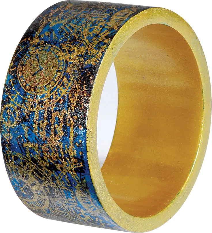 Squeeze several drops of both Sailboat Blue alcohol ink and Alcohol Blending Solution onto your felt applicator. Dab all over outside of bangle for a mottled blue effect. Apply another coat for a darker color if desired. Place the clock/texture stamp on your acrylic block and ink up with Timber Brown Stazon. Place the block stamp side up and roll the bangle onto the stamp. Ink, and stamp again, covering the whole bangle.