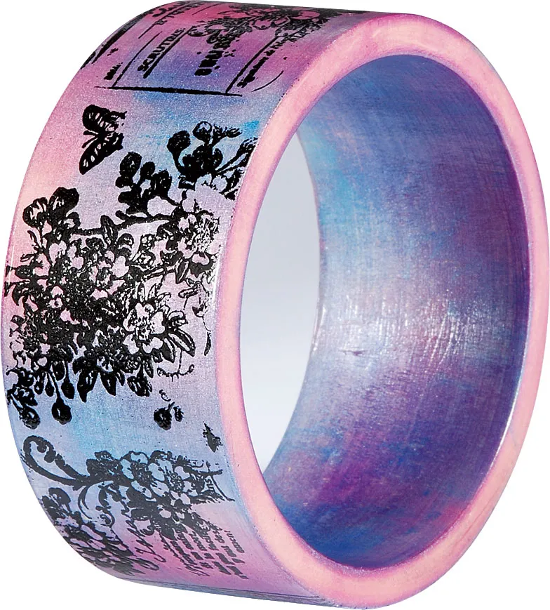 Use the cosmetic sponges to apply all four colors of ink to the bracelet, covering it in a random fashion and overlapping some areas. Heat set with the embossing heat tool. Allow the bracelet to cool, and make sure the ink is completely dry and not tacky. Place a stamp you wish to use on the acrylic block and ink it with VersaMark. Stamp onto the bracelet in a rolling fashion. Replace the stamp on the block with another stamp and repeat next to the first image on the bracelet. Sprinkle the stamped images with black super fine embossing powder and emboss with the heat tool. Stamp and emboss a few more images at a time around the bracelet to finish the design.