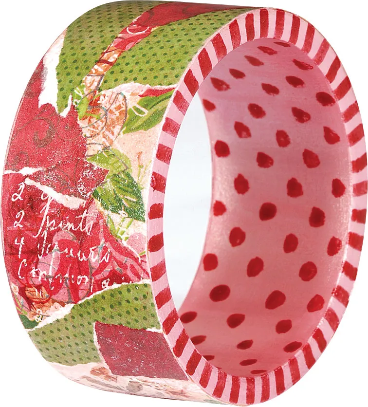 Take the red swirl, green dot, and rose corner paper in Roses In Harmony and tear about 10 small pieces of each. On a plastic lid or paint palette, use a paintbrush to mix a teaspoon of Tacky Glue with 4 drops of water. Brush a coat of the mixture on the outside of the bangle. Place the torn pieces of paper over the wet glue until you’ve covered the whole surface. Trim the edges flush with the bracelet by cutting along the edges with scissors. Make sure all the pieces are completely glued down, if not, add a bit more glue with a small paintbrush.