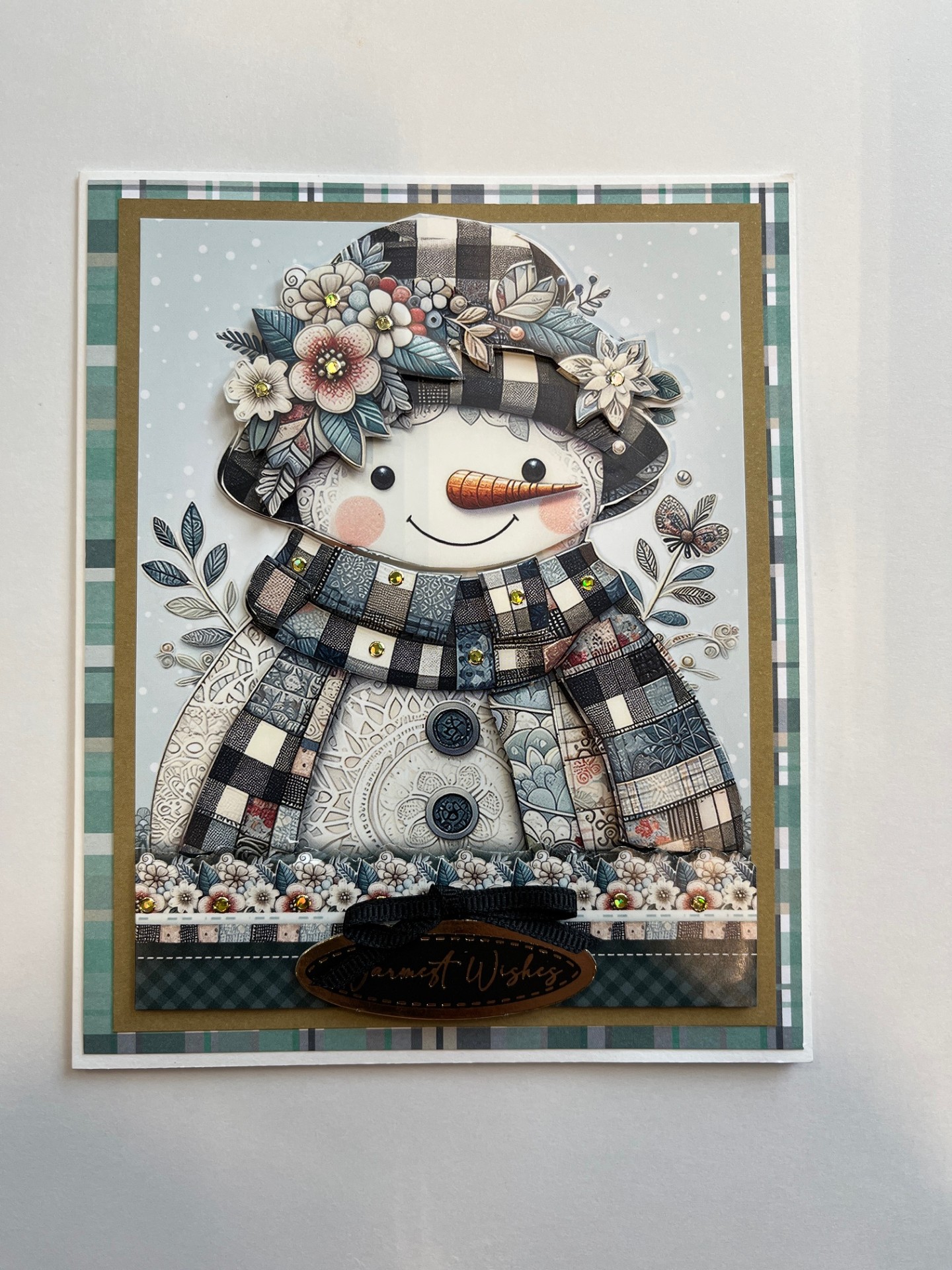 Trim a white card to 5”x6”. Cut 4 7/8”x 5 7/8” teal plaid Christmas Floral Plaids 12x12 Patterned Cardstock and tape to card front leaving 1/16” white borders. Remove 1/2” from the bottom of the snowlady plaid Little Book and mat on tan Christmas Floral Plaids 12x12 Solid Cardstock leaving 1/8” tan borders. Attach to the card.