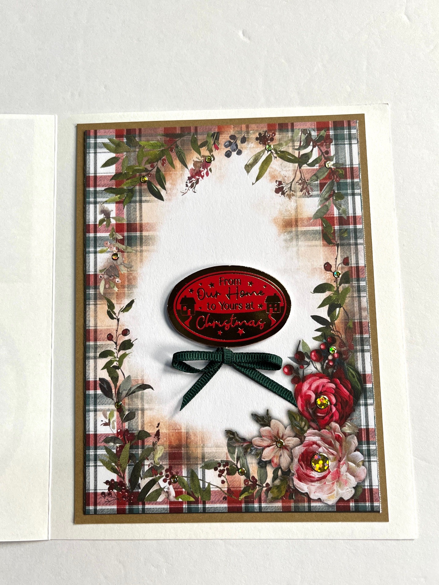 Card inside: Trim a large cutout from Christmas Floral Plaids 12x12 Patterned Cardstock. Mat on tan Christmas Floral Plaids 12x12 Solid Cardstock leaving 1/8” tan borders. Attach to the card. Foam tape “From our home to your” sentiment to the center. Make and Zot™️ a 2” wide green bow from the 1/8” Ribbon Set and place below the sentiment. Place gold Jewel Dazzles™️ as shown.