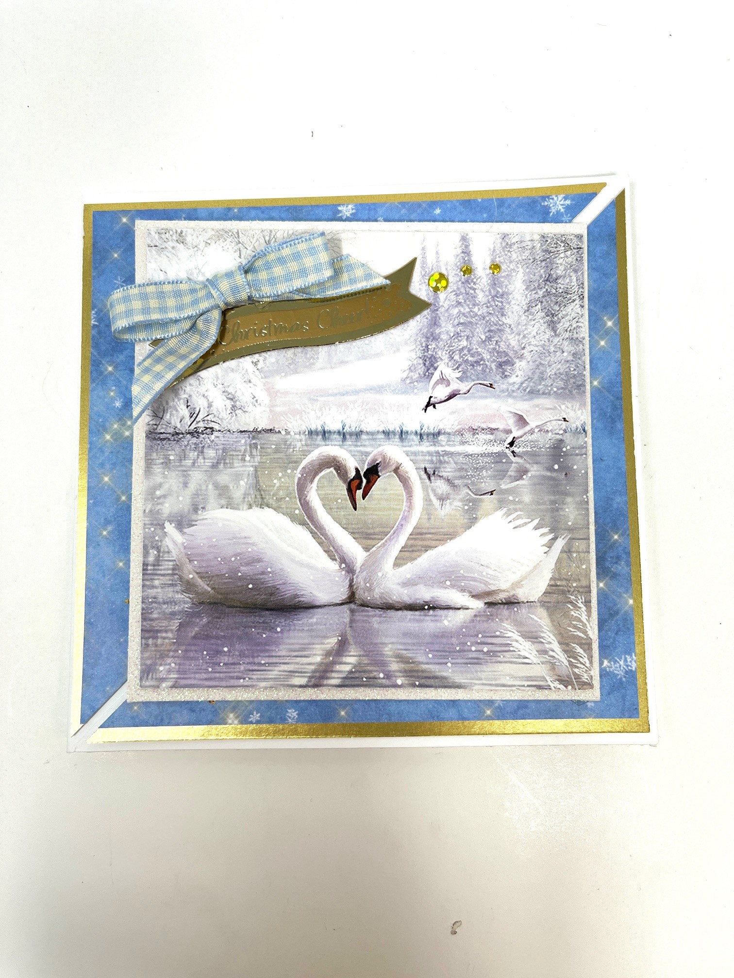 Cut 4”x4 1/8” white glitter cardstock and tape only to the bottom of the card. Trim Little book page to 3 3/4”x4” and tape to white cardstock leaving 1/16” white glitter cardstock. Foam tape “Christmas Cheer” sentiment to top left corner. Trail gold Jewel Dazzles™️ off the right of the sentiment. Make and Zot™️ a 2” wide gingham bow from the Blue Ribbon Set and place on the sentiment.