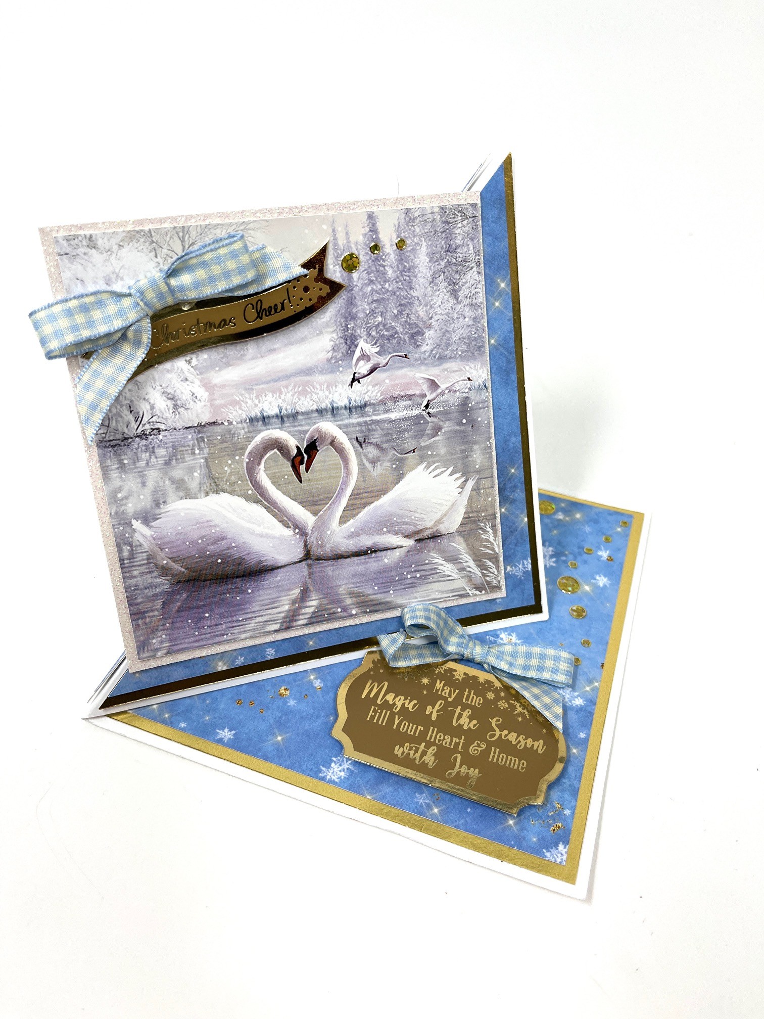 Trim a white blank card to 5”x5” square card. Use the Adorable Scoreable Mini to create a fold on the card front from the bottom left to top right corners and fold inward. Cut a 4 3/4” square of Gold Metallic cardstock and set aside. Cut 4 5/8” square of starry sky Christmas Critters 12x12 Patterned Cardstock and tape to the gold cardstock. Cut on the bottom left to top right and tape flush to the fold leaving 1/16” white borders (if necessary, trim the center area).