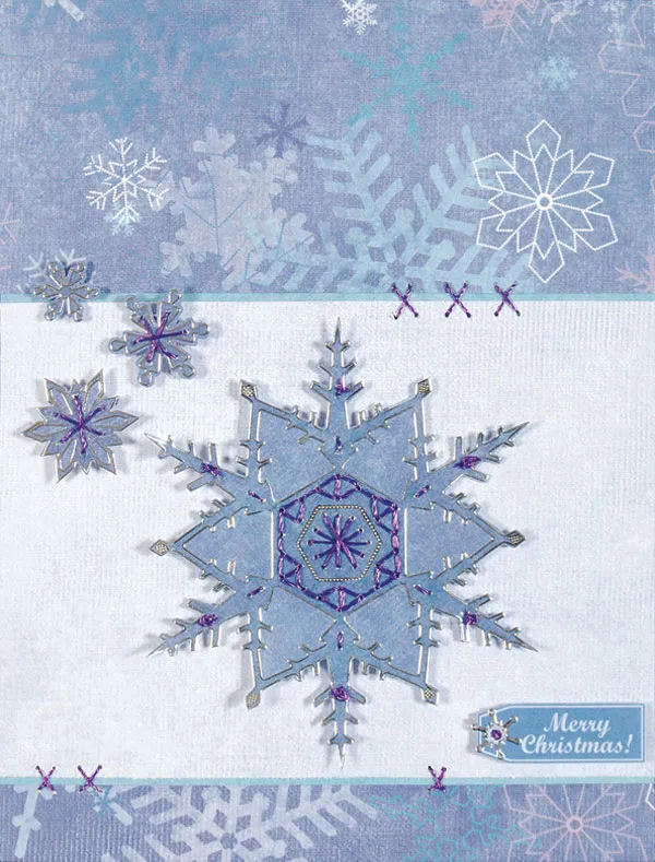 Back the snowflake Dazzles with blue paper. Stitch the snowflakes following the instructions on the back of the Dazzles package. Add the large snowflake to the center of the mat with foam tape. Attach 3 more snowflakes to the top left of the first. Cut out the "Merry Christmas" tag and attach to the bottom of the mat with foam tape.