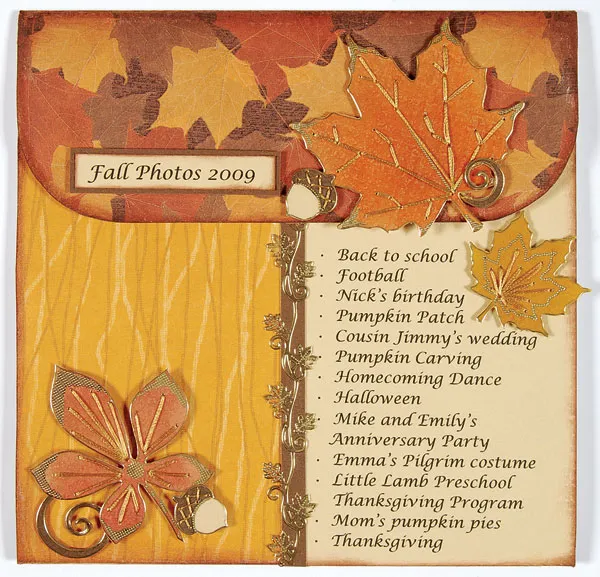 Back acorn stickers with tan and brown cardstock and stitch the tops with gold thread. Glue one acorn to the brown strip on the back and foam tape another near the label on the flap.