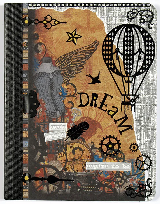 Place the Steampunk Scrapbooking Dazzles™ in this order: Dream along the curve with the bird above it. Chain at the top. Place the gear border along the back of the book. Place the corners then the hot air balloon. Add the others as shown.