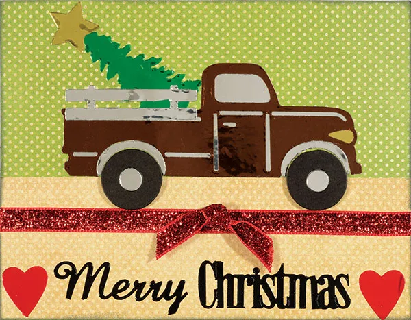 Cutting the truck pieces: Use the cutting dies to cut a Brown Mirror truck. Peel off the backing of the truck and place a small piece of gold behind the headlight. Place the whole truck on a Silver Mirror sheet. Cut around the outside edge. Cut the tires free from the truck. Use the truck cutting die to cut tires from black cardstock. Use the truck cutting die to cut silver mirror tire fenders, and the tire hubcaps. Use the truck rack cutting die to cut a silver mirror truck rack. Use the tree cutting die to cut a tree, and star cutting die to cut a gold star.