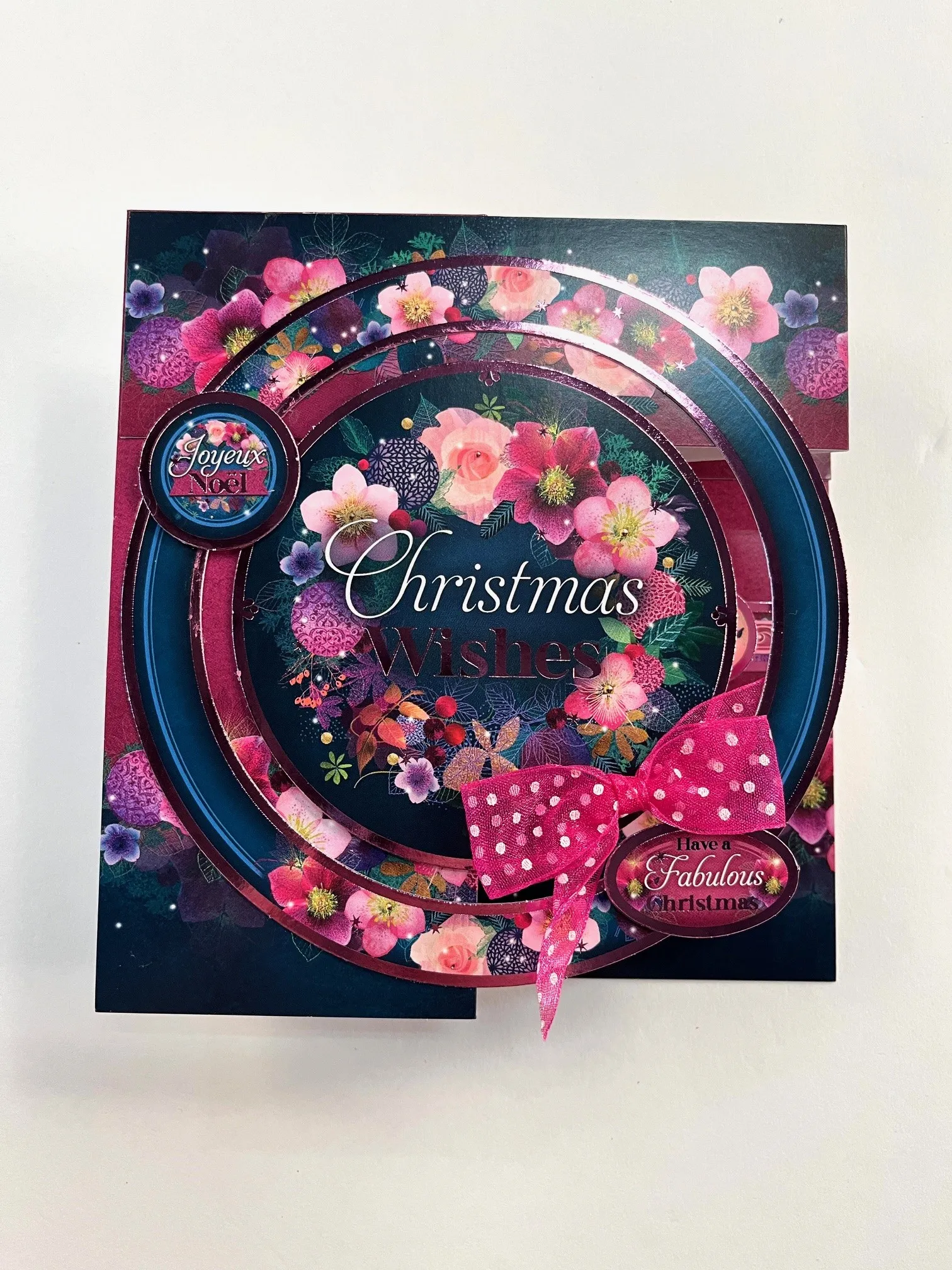 Glue the left end of the border (the 5 1/2" length) to the left folded side. Glue the 8 1/4" side flush to the top and right sides. Glue the circle frame Topper to the left side and foam tape the inner circle Topper along the left side. Foam tape "Joyeux Noel" on the left of the frame. Foam tape " "Have a fabulous Christmas" Topper on the lower right. Make and Zot™️ a 2" wide pink ribbon as shown.