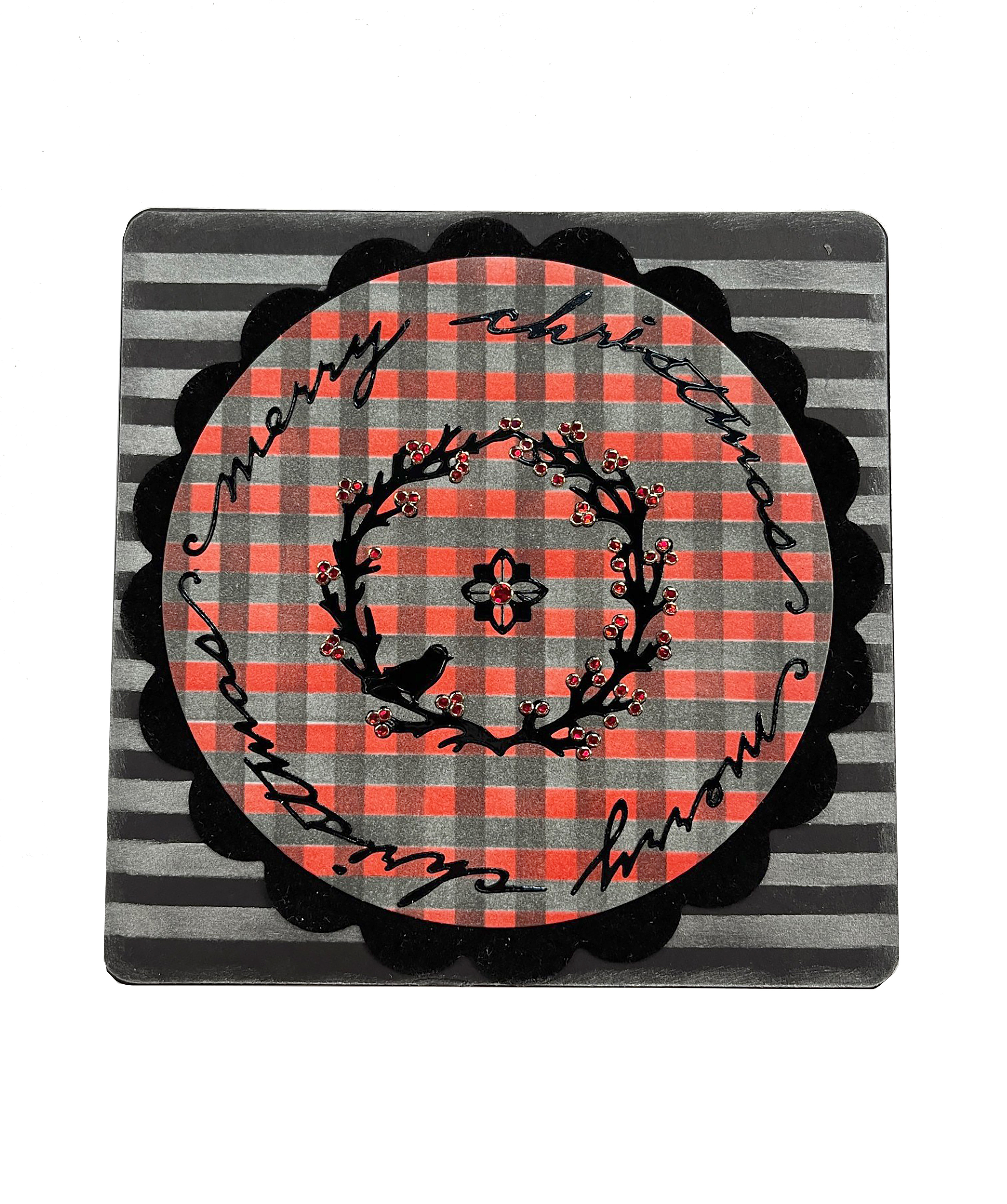 Place the mask with stripes going Horizontally on a 6 ½”x6 ½” white cardstock. Ink with Letterbox Red Ink. Remove stencil. Wash the stencil.