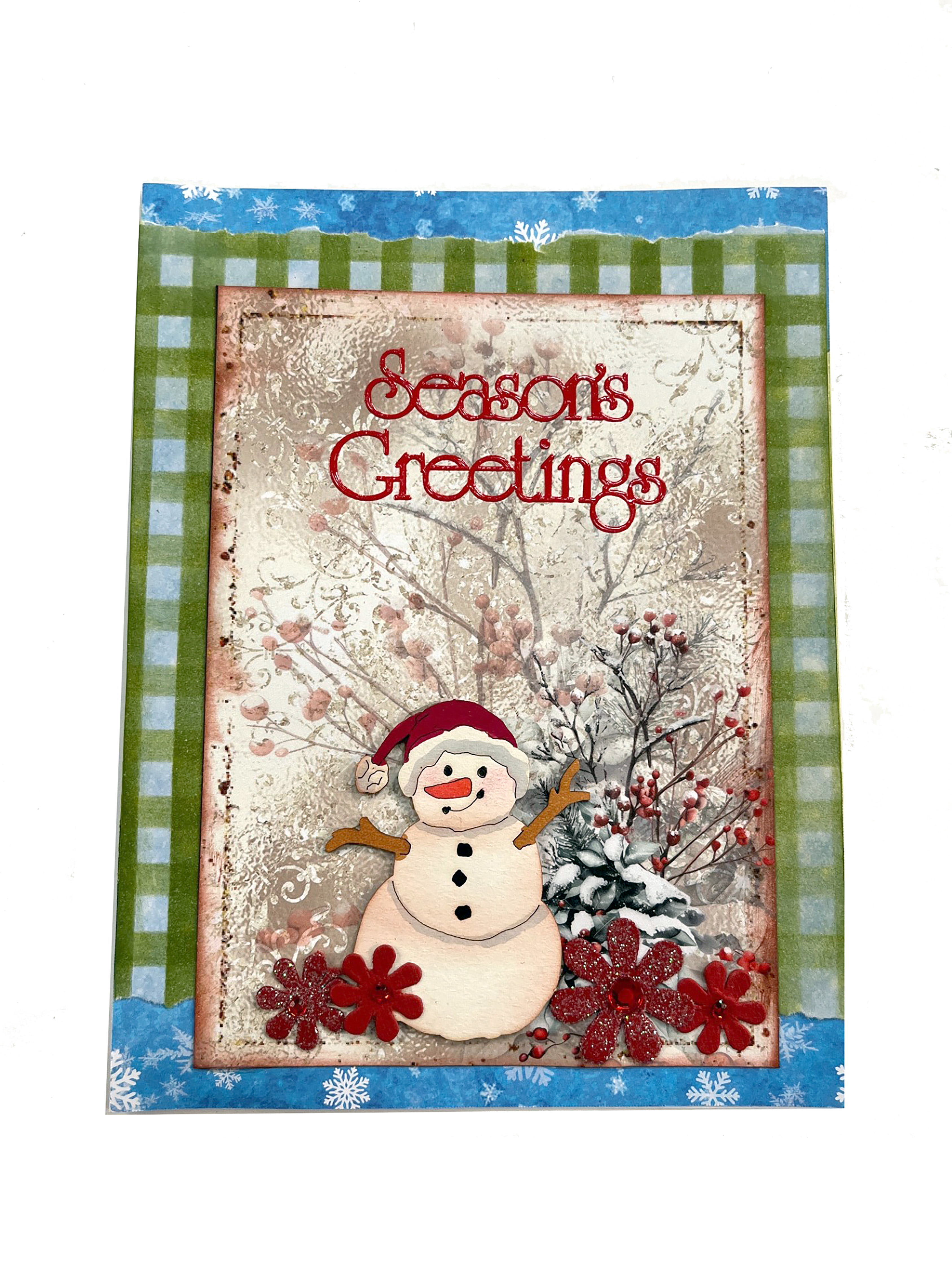Tip: Attach the Gingham stencil to the light blue snowflake paper using low tack tape. Apply Khaki ink to the blending tool and then apply ink to the stencil using light, circular motion.