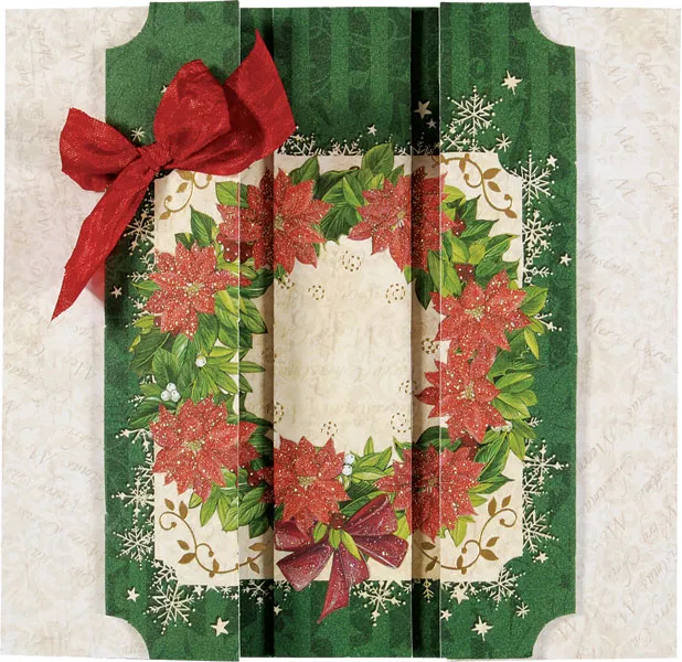Cut Wreath paper with the green border to 5 1/2”x5 1/4&rdquo,; glue to the inside of the card with the green border at the top.