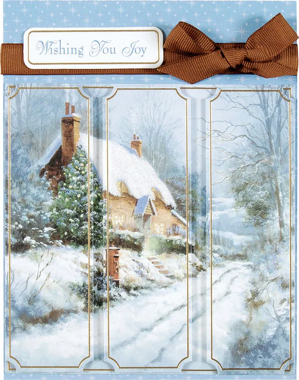 Assemble the Cottage papier tole using foam tape and glue centered on the card 1/16" from the bottom.