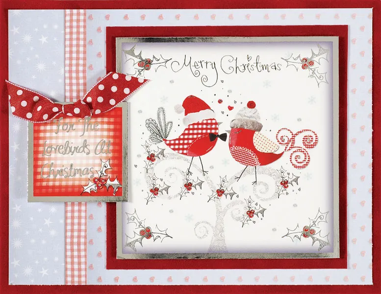 Foam tape the Hunkydory Stylish Season Kit Love Robins “For the lovebirds…” die-cut overlapping the left edge and top with a knotted length of 1/2” wide red Poke a dot ribbon.