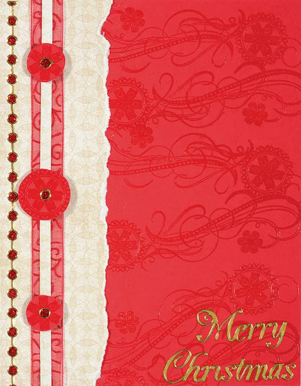 Cut a 2”x6½” Christmas Sweets tan/cream circle paper. Tear one long edge. Wrap a 7” red swirl ribbon around the paper vertically. Tape the ends on the back to secure. Glue to the card front so the straight edge is even with the fold. Place a length of Red Jewel Border Dazzles™ close to the left edge. Cut a 1/8”x6½” Christmas Sweets tan/cream paper, and glue it to the middle of the ribbon. Foam tape the three circles from Step 2 on the ribbon, with the large circle in the middle, and the smaller circles above and below as shown. Place the “Merry Christmas” Dazzles™ on the bottom right corner.