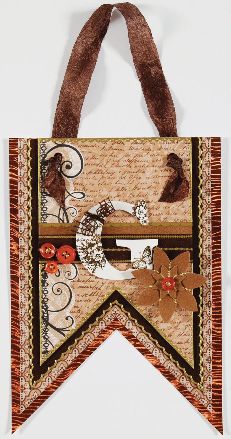 Ink the edges of the chipboard shape and cover the with tan text paper. Re-punch the holes at the top. Cut out an the scrollwork motif from the scroll bordered paper and glue it to the left side of the chipboard.