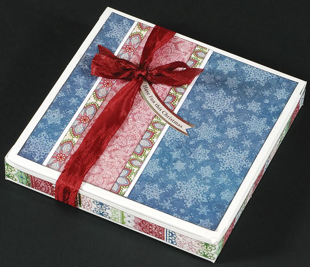 Glue the snowflake paper to the box top. Wrap the box with a length of 5/8” wide Christmas Lace burgundy crepe ribbon and tie a bow over the border as shown.