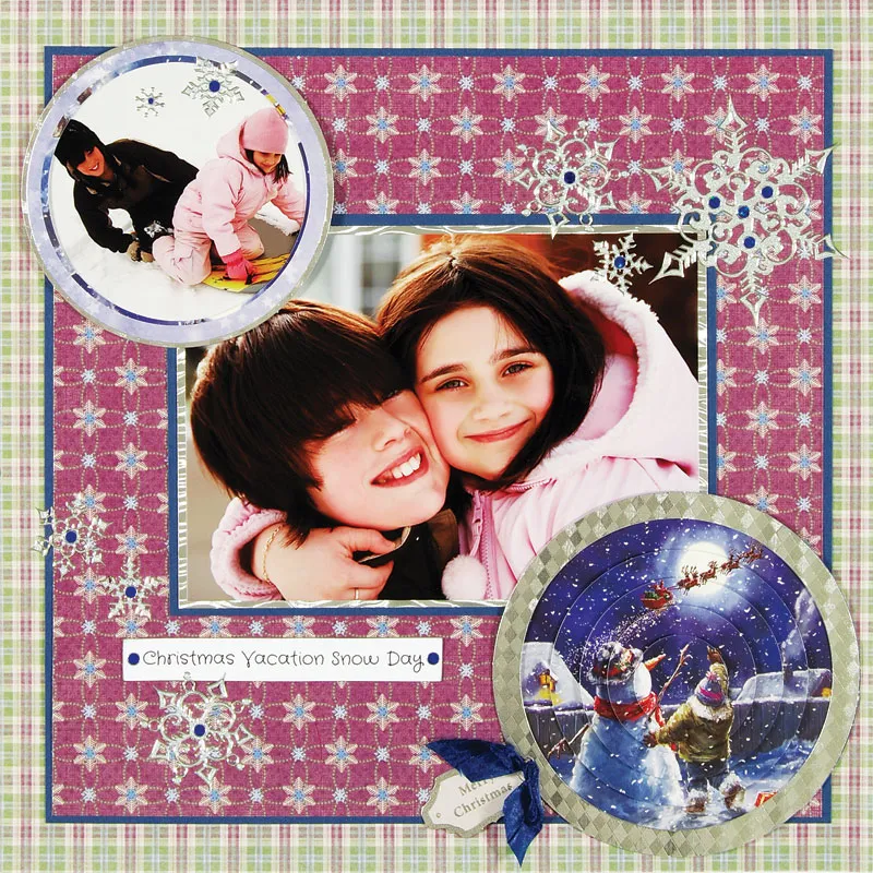 Glue the Rocking Robin “Happy Christmas” die-cut label to the bottom left corner of the photo mat and Zot a knotted length of Simply Susan purple ribbon to the end. Write or print on thin strips of white cardstock and ink edges. Mat with aqua Princess Cardstock, leaving 1/8” borders. Glue to the border as shown.