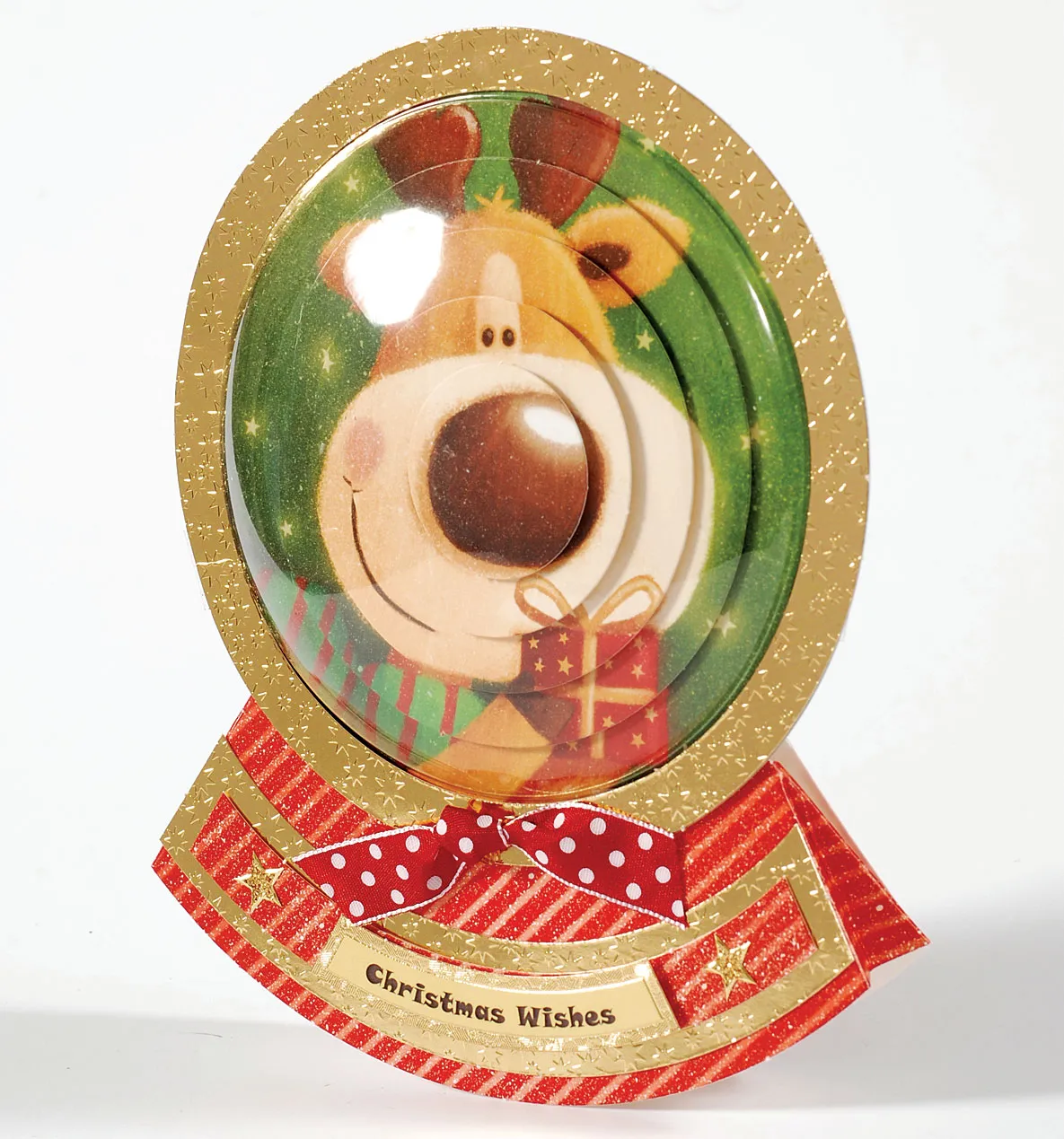 Assemble the Hunkydory Rocking Reindeer pyramid pieces with foam tape. Glue a snow globe on top and glue the gold textured surround over the edge of the snow globe.